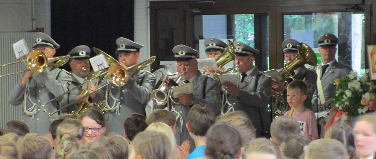 Vor dem großen Trubel fanden das Kleinenbroicher Schützenkönigspaar und sein Gefolge noch Zeit unsere Schule zu besuchen. Besondere Stimmung schaffte die mitgebrachte Livemusik!